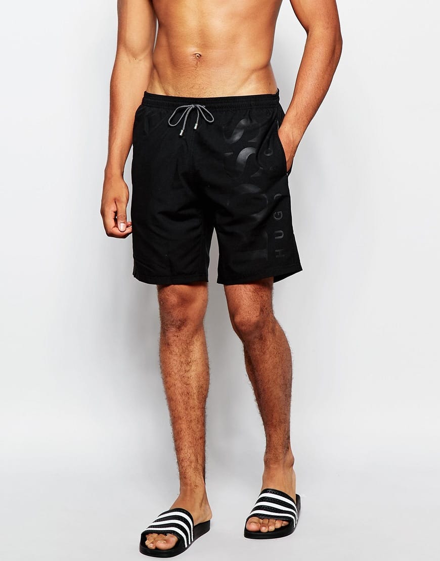 Swim shorts by Hugo Boss Mesh lining Drawstring waistband Branded print Side pockets Single back pocket Machine wash 100% Polyester