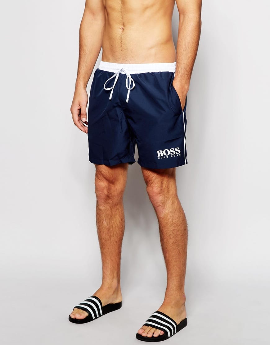Swim shorts by Hugo Boss Shirred custom fit waistband Contrast drawsrting ties Side seam pockets Logo detail Exclusive to ASOS